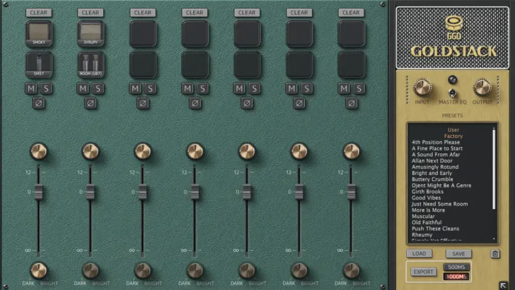 In the Goldstack interface, you’ll notice the Dark / Bright knobs at the bottom of each channel strip. This is crucial for managing the room sound.